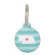 Dejen que su amigo muestre algo de orgullo en el estado de casa con esta linda etiqueta de identificación de mascota de Nebraska. El diseño presenta un mapa de silueta blanca del estado de Nebraska con un corazón rosado en el interior, sobre un tono de fondo de rayas turquesa de tono. Añada el nombre de su mascota y la información de contacto a la parte posterior con letras blancas en un fondo acuático.