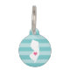 Dejen que su amigo muestre algo de orgullo en el estado de casa con esta linda etiqueta de identificación de mascota de Nueva Jersey. El diseño presenta un mapa de silueta blanca del estado de Nueva Jersey con un corazón rosa en el interior, sobre un tono de fondo turquesa de rayas. Añada el nombre de su mascota y la información de contacto a la parte posterior con letras blancas en un fondo acuático.