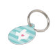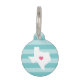 Dejen que su amigo muestre algo de orgullo en el estado de casa con esta linda etiqueta de identificación de mascotas de Texas. El diseño presenta un mapa de silueta blanca del estado de Texas con un corazón rosa en el interior, sobre un tono de fondo de rayas turquesa. Añada el nombre de su mascota y la información de contacto a la parte posterior con letras blancas en un fondo acuático.