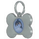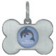 Esta placa de identificación para mascotas con forma de hueso tiene un delfín saltarín de tipo dibujo animado que es azul oscuro y blanco con un ojo de remolino negro y blanco sobre un fondo azul claro. Personaliza el nombre y tu número de teléfono con la plantilla.