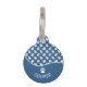 Este diseño está dividido con una forma de onda linda. En la parte inferior hay un área de texto curvo personalizable para el nombre de la mascota, mientras que en la parte superior hay un patrón de huellas de patas de perro blancas sobre un fondo azul. En la parte posterior hay un área de texto personalizable para un número de teléfono. También hay una pequeña huella de pata de perro blanca justo encima del texto.