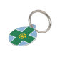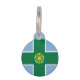 Etiqueta de mascotas con diseño con una bandera del condado histórico de Derbyshire, en Inglaterra, Gran Bretaña; bandera azul con una cruz verde y un rosa Tudor de oro en el centro