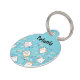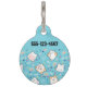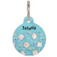 Una etiqueta para mascotas con un patrón de gato lindo, puesta sobre un fondo azul y decorada con arcoíris y huellas de patas y más.
