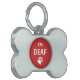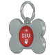 Sencilla etiqueta roja y blanca para mascotas sordos. "Soy sordo" texto en el medio y una pequeña silueta de papel blanco en la parte inferior.
