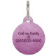 Una etiqueta falsa de mascota de cuero lila con espacio para el nombre de su mascota y su número de teléfono u otra información de contacto.