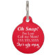 Huella de pata con brillo azul con el nombre del perro en el frente con fondo blanco, en la parte posterior fondo de alerta rojo con texto blanco que dice OH Snap! Estoy Perdido - Llama a Mi Mamá, Ella está llorando feo. El fondo rojo llama la atención a la etiqueta para que alguien que encuentre el perro se asegure de ver la alerta.