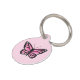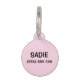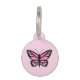 El encantador ilustracion de una mariposa rosa en un color rosa claro de fondo. En el otro lado hay áreas de texto personalizables para el nombre del mascota y para un número de teléfono.