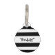 Personalizar esta etiqueta moderna de identificación mascota de rayas blancas y negras con el nombre de su mascota y el texto de información del código QR en la parte posterior. Reemplace el ejemplo de código QR por el suyo propio. Hay muchas páginas en la web donde puedes crear tu propio código QR. En funda su mascota se pierde, alguien puede tener fácilmente su información de contacto.