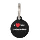 Etiqueta de identificación para gatos y perros con color de fondo negro y color de letra blanco impresa con la plantilla personalizable de texto "Me encanta mi Labrador" en gorras, camisetas y productos para mascotas por la tienda bajo demanda TheFabricSeal en Zazzle.com #ZazzleMade https://www.zazzle.com/store/thefabricseal