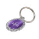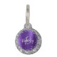 Esta etiqueta de identificación mascota personalizada de glam incluye el primer monograma de su mascota y su nombre en un guión moderno en blanco y gris sobre un fondo metalizado morado y cepillado enmarcado por un purpurina falso plateado. Añade tu número de teléfono al revés.