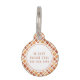 Esta etiqueta personalizada de identificación mascota muestra el nombre de su mascota en un fondo de patrón de manto naranja, blanco y borgoñona. Atrás se muestra la información de contacto.