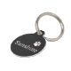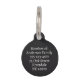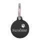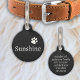 Diseño simple en blanco y negro con el nombre y la dirección de tu mascota, tu número de teléfono o texto. Y una huella de pata a juego.