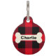Esta etiqueta rústica de identificación de perro con mantas de búfalo rojas y negras muestra un hueso blanco en la parte delantera con un lugar para el nombre de su perro que usted puede personalizar. La parte posterior de la etiqueta tiene un fondo negro con texto en blanco y un lugar donde poner tu nombre y número de teléfono para ayudar a mantener a tu mascota a salvo. Diseñado por la artista ©Susan Coffey.