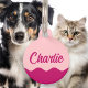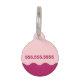Etiqueta de identificación de mascota con el nombre de tu mascota en blanco sobre un fondo rosa claro con el número de teléfono en la parte posterior. Las fuentes y los colores son personalizables en la herramienta de diseño.