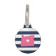 Dejen que su amigo muestre algo de orgullo en el estado de casa con esta linda etiqueta de identificación de mascota de Oregón. El diseño presenta un mapa de siluetas blancas del estado de Oregón en rosa con un corazón blanco dentro, sobre un fondo de rayas azul marino y blanco preppy. Agregue el nombre de su mascota y la información de contacto a la parte posterior con letras blancas en un fondo rosado.
