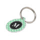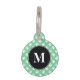 Esta placa para mascotas tiene un círculo negro en el medio con una letra de monograma personalizable. El color de fondo es verde menta con un patrón de patas de perro pequeñas blancas. En el otro lado hay áreas de texto personalizables para el nombre de su mascota y para su número de teléfono.