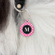 Esta etiqueta para mascotas tiene un círculo negro en el medio con una letra de monograma personalizable. El color de fondo es rosa con un patrón de patas de perro pequeñas blancas. En el otro lado hay áreas de texto personalizables para el nombre de tu mascota y para tu número de teléfono.