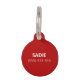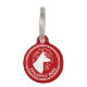 La silueta de retrato original de Destei de la cabeza de un perro negro que se parece a un pastor alemán y razas similares con orejas rectas. Alrededor del perro hay líneas agudas que ilustran un ataque epiléptico. Bajo el perro hay un área de texto personalizable que ahora dice: "Perro epiléptico". En el otro lado hay áreas de texto personalizables para un nombre y un número de teléfono. El color de fondo es rojo. Difunde la conciencia de la epilepsia de su mascota.
