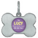 La etiqueta personalizada de identificación de Personalizado de perros con Chica púrpura es un adorable mascota para mantener su información de contacto en el cuello de su mascota. Incluye un hueso de forma plateada con el nombre del mascota y su número de teléfono en funda que su mascota decide dar un paseo o se pierde. El círculo violeta redondo del centro tiene el nombre de tu mascota con letras amarillas. Haga clic en la opción de personalización y siga el mensaje.