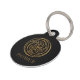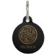 Dramático color negro y oro intrincado triple nudo celta girando mandala. Espirales eternas y nudos de trinidad en oro sobre fondo negro. Personalizado con el nombre de su mascota y su número de teléfono, o como regalo.