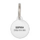 Plantilla de fotografía mascota de forma cardíaca personalizable. La forma del corazón tiene un borde. Reemplace la foto de ejemplo con la suya propia. El otro lado tiene áreas de texto personalizables para el nombre del mascota y el número de teléfono del propietario.