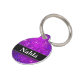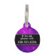 Purpurina púrpura complementado con texto en blanco y negro. Ideal para perros y/o gatos. Actualice el nombre delante al nombre de su mascota. Imprima su número de teléfono u otra información de contacto en la parte posterior.