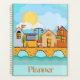Un diseño de planificación con colores vivos y atractivos, el mar azul, las nubes y el sol, y los edificios naranjas. Es verdaderamente maravilloso y te da alegría empezar a planear tu día mientras te sientes feliz.
