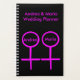 Este impresionante planificador de bodas está diseñado para lesbianas. Cuenta con dos símbolos femeninos rosados uno al lado del otro. El fondo es negro y hay un texto rosa personalizable dentro de cada uno de los símbolos para poner nombres.