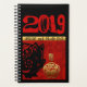 En un cuadrado hay dos cerdos: uno (estilo chino de papeleo negro) parece salirse con una forma de papeleo dorado (dentro está el segundo cerdo con el símbolo chino). Detrás de ellos hay un fondo rojo formado por grandes letras decorativas y ornamentadas con las palabras: "Año del cerdo" y en la parte superior "Año del cerdo" + gran 2019. Diseño en planner espiral con fondo negro. Puede cambiar fácilmente el año (fuente, color, tamaño y posición) haciendo clic en el botón personalizar. Productos de oficina, productos para el hogar, tarjetas de felicitación, postales, productos artesanales y más. Perfecto para el Año Nuevo Chino 2019 del Cerdo o cumpleaños (personas nacidas en el año del Cerdo).
