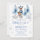 Invierno de ciervo Cute Niños despectivos cumpleaños plantilla editable invitación descarga digital instantánea, acuarela lindo ciervo bebé con gorra de invierno y bufanda de pinos nevados invitación de fiesta de primer cumpleaños para un niño con temática de invierno