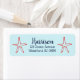 Plantilla de etiqueta de dirección con temática de playa con letra de escritura a mano de guión y colores azul y rojo. Presenta un diseño sencillo de pez estrella.