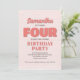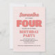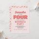¡Haga su día extra especial con la invitación de esta fiesta de cuarto cumpleaños de este chica! Con una tipografía rosa de "cuatro", un lindo patrón floral y una plantilla simple, este diseño es perfecto para una celebración moderna y minimalista. El capricho de la caligrafía añade un toque divertido, mientras que las elegantes flores de moda aportan un ambiente elegante y luminoso. Personaliza esta encantadora invitación hoy para una divertida e inolvidable celebración de cumpleaños.