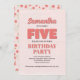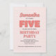 ¡Haga su día extra especial con la invitación de esta fiesta de quinto cumpleaños de este chica! Con una tipografía rosa de "cinco", un lindo patrón floral y una plantilla simple, este diseño es perfecto para una celebración moderna y minimalista. El capricho de la caligrafía añade un toque divertido, mientras que las elegantes flores de moda aportan un ambiente elegante y luminoso. Personaliza esta encantadora invitación hoy para una divertida e inolvidable celebración de cumpleaños.