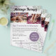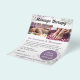 Anuncie sus servicios de terapia de masaje con un folleto que comparta la información de su negocio y lista de precios. El diseño incluye hojas de lavanda floral púrpura y verde salvia. La parte delantera tiene imágenes editables, así como le permite compartir una descripción sobre sus tratamientos, la ubicación de su negocio, número de teléfono, correo electrónico y sitio web. Una burbuja de función le permite mostrar una oferta especial para sus clientes. La parte posterior le permite enumerar sus tratamientos y lista de precios, ya sea masajes prenatales o de tejido profundo, tal vez pedicuras, manicuras y faciales, personalice al contenido de su corazón.