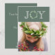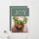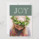 Tipografía festiva de "Alegría" con corona de eucalipto falso para la letra "O". Agregue su foto personal para completar esta tarjeta de vacaciones. Agregue su propio sentimiento de vacaciones y nombres en el reverso. El patrón en el frente se lleva al dorso de esta tarjeta.