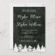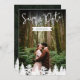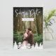 Una tarjeta de aviso de fecha de dos caras que presenta su propia foto en la parte frontal con las palabras "Guarde la fecha" y una fecha de boda personalizable que se muestra sobre una simple forma de cinta blanca. La parte trasera muestra una foto del paisaje forestal de Destei con espacio para detalles adicionales de la boda. Una fila de siluetas de abetos bordea la parte inferior, añadiendo un toque de bosque. Perfecta para bodas de senderismo, celebraciones al aire libre y eventos inspirados en la naturaleza, esta elegante tarjeta combina momentos personales con belleza escénica.