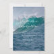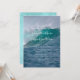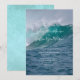 Plantilla de invitación de boda en la costa con una gran imagen de fondo de olas del océano. Su texto se agrega en tres secciones. Se utiliza un estilo de letra impresa para el texto "se solicita el honor de su presencia" en la parte superior, y también para el párrafo que contendrá toda la información de la ceremonia y recepción. La plantilla para los nombres de la pareja es una escritura moderna a mano. Se pueden usar nombres completos o solo los primeros. El agua azul profundo del mar y las crestas turquesa de las olas rompientes son los colores de la naturaleza que hacen de esta una invitación emocionante para las parejas que aman el océano. El reverso es espuma de mar azul.