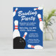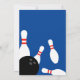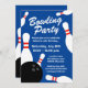 Plantilla de invitación de cumpleaños de bolos moderna. Invitaciones geniales con bolas de bolos negras y bolos blancos. Personaliza con tu propio nombre y texto. Actividad divertida para niños y adultos. Fondo azul o de color personalizado. ¡Vamos a divertirnos!