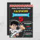 PLANTILLA DE INVITACIÓN DE CUMPLEAÑOS DEL CHICO KARATECA FIESTA DE CUMPLEAÑOS DE NIJA, FONDO NEGRO, LETRAS DE PIZARRA, COLORES PASTEL AMARILLO, VERDE, ROJO, AZUL