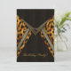 Plantilla de invitación de fiesta de cumpleaños, aniversario, despedida de soltera y ocasiones especiales con estampado de leopardo en negro y dorado. Personalice los lados delantero y trasero de esta invitación de evento multipropósito. También puede cambiar el estilo de fuente, el color de fuente y el color de fondo.