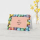 Una vista cercana de jelly beans de colores pastel en el fondo y una caja de coral con un borde blanco espera tu mensaje personal