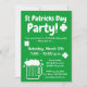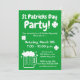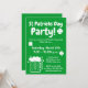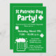 Plantilla de invitación de fiesta del personalizado St Patrick's Day. Personalizable para fiestas en casa, pub, bar, oficina, evento, etc. Diseño del Día de San Pattys verde Kelly con chispas suertudas y una olla de cerveza. Impresión de trébol de 4 hojas para su celebración irlandesa del Día de San Paddys. Tipografía divertida con logo.