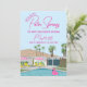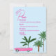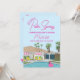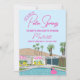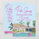 Haz que tu despedida de soltera sea inolvidable con esta elegante invitación para una despedida de soltera al estilo de Palm Springs. Con una casa de mediados de siglo dibujada a mano de estilo retro, este diseño vibrante captura la esencia chic y relajada de Palm Springs con una escena junto a la piscina, palmeras y un flotador de flamenco rosa.