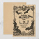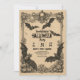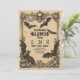Una invitación de fiesta de Halloween de estilo vintage con decoraciones góticas ornamentadas, murciélagos, calabazas, calaveras y detalles florales, diseñada sobre papel pergamino envejecido para un aspecto espeluznante y elegante