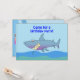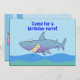 El frente de estas invitaciones tiene un tiburón personalizado lindo. Es azul y púrpura y está sonriendo con grandes dientes y babeando. Dice: "Ven a una fiesta de cumpleaños".