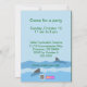 La parte trasera de la invitación tiene una imagen azul de las olas del océano con dos aletas de tiburón en el agua. También hay espacio para los detalles de su fiesta aquí para personalizar.