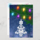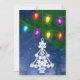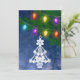 Este diseño de formato vertical presenta una fotografía de un adorno de árbol de Navidad blanco ornamentado y coloridas luces de Navidad vintage. Personalice el saludo de vuelta o elimine el texto de una pizarra en blanco lista para una nota manuscrita.
