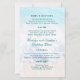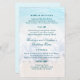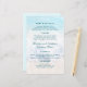 Menú boda con fondo de playa. Agua azul claro, espuma de mar y arena fina son el fondo de un texto azul verde azulado y personalizado. Los nombres de la novia y del novio están en el centro del periódico. Personalizar cuatro secciones con información del menú.