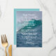 Plantilla de menú boda de ondas oceánicas. El tipo de letra negrita, blanca y manuscrita se imprime sobre un fondo de onda chisporroteo en tu elección de papel especial. Nombres de la pareja en la parte superior con el texto "menú boda". Todos los elementos de menú se agregan en forma de párrafo. Añadir o quitar espacios según sea necesario. El texto del menú de ejemplo utiliza letras mayúsculas para el título de cada sección.