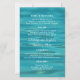 Menú boda económico con fondo marino. Las olas de agua son el fondo para el texto blanco y personalizado. Los nombres de la novia y del novio están en el centro del periódico. Personalizar cuatro secciones con información del menú.